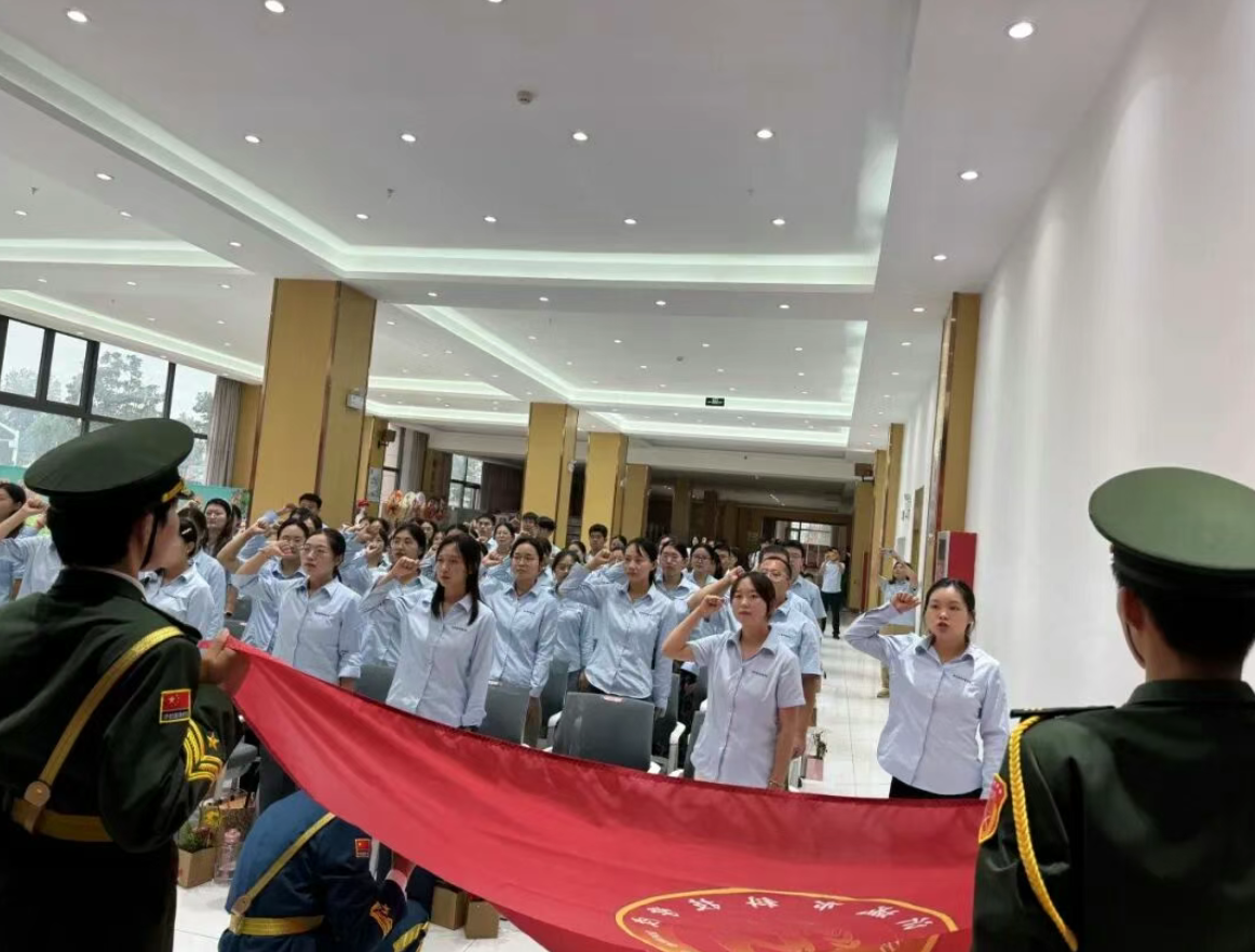 随后,2025年新入职教师迎来重要时刻。在国旗护卫队护送校旗入场后,全体新教师面向校旗、举起右手,在吴殿美老师的领誓下庄严宣誓,以铿锵誓言承诺坚守教育初心,履行教师职责。