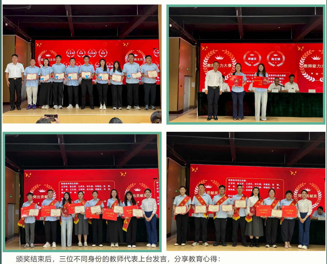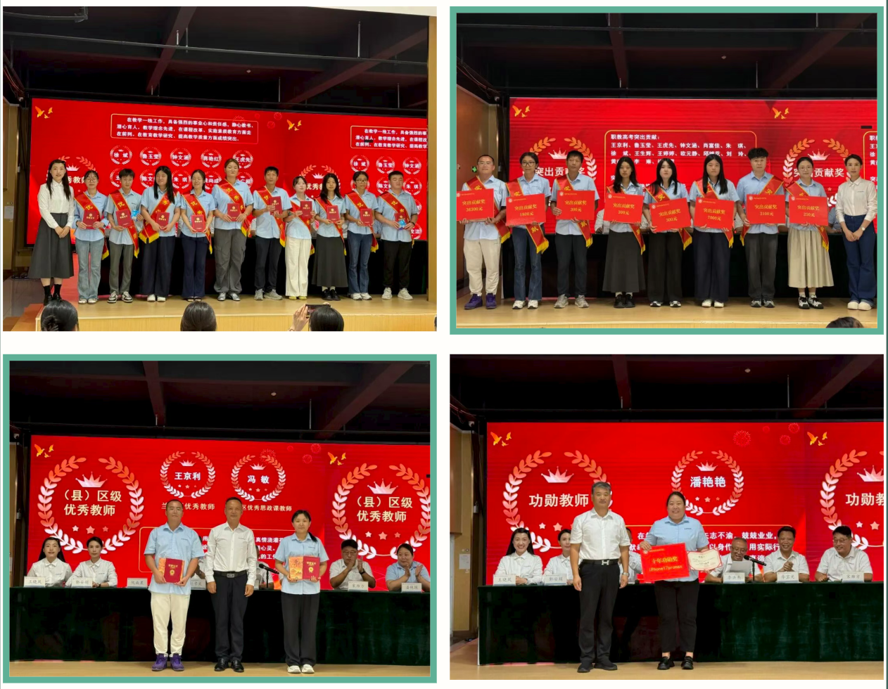 此次表彰覆盖教学、管理、技能竞赛、高考攻坚等多个维度,共表彰“优秀教师”“优秀教育工作者”“教学能力大赛获奖教师”“优秀班主任”“突出贡献奖”“区优秀教师”“模范教师”“功勋教师”八大类先进个人。校领导分别为获奖教职工颁发证书及奖品,台下掌声此起彼伏,既是对获奖者的祝贺,更是对全体教师辛勤付出的认可。