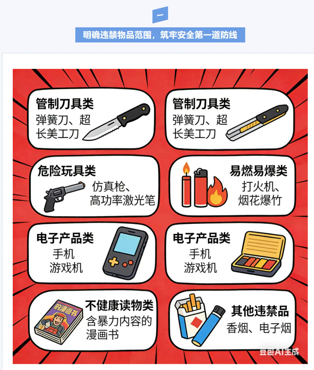 1. 强化安全教育:请您结合具体案例,向孩子耐心讲解违禁物品的危害,帮助孩子认清携带违禁物品的严重性,树立“安全第一”的意识,从思想上杜绝携带念头;