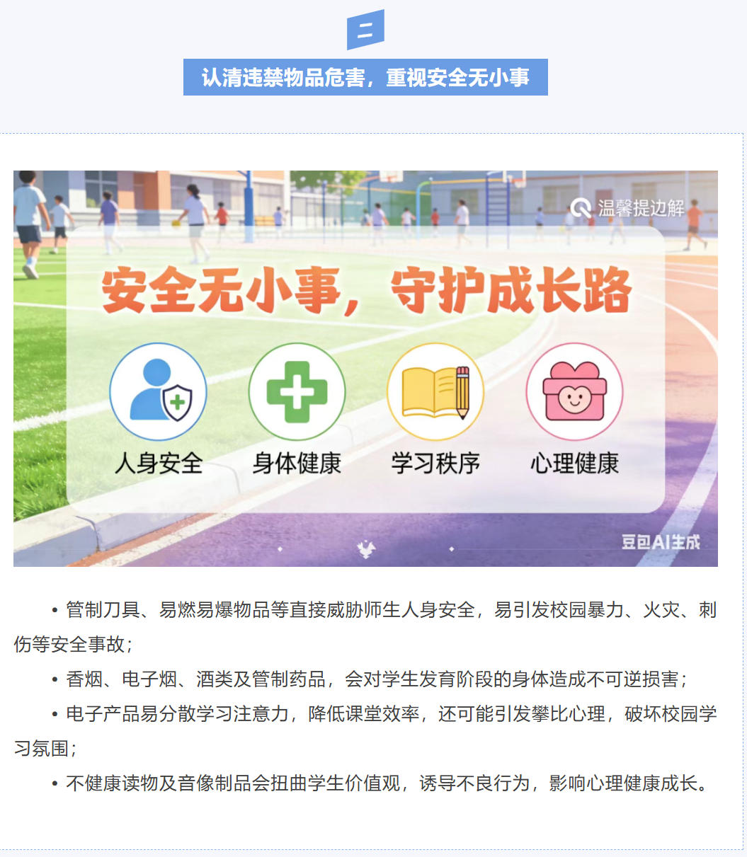 3. 积极配合学校:主动与班主任、学校保持常态化沟通,及时了解孩子在校动态。若学校发现孩子携带违禁物品,恳请您给予理解支持,不推诿、不包庇,与学校共同分析原因,制定教育引导方案,帮助孩子改正错误、健康成长。